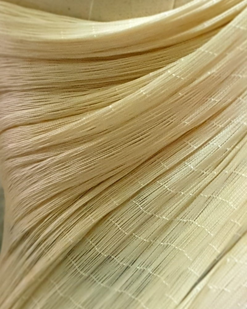 A humble nylon thread, traditionally found in the hands of cobblers, becomes the heart of the collection—reimagined, repurposed, and elevated into couture-level construction. This material choice becomes a poetic metaphor for the journey from the ordinary to the extraordinary.